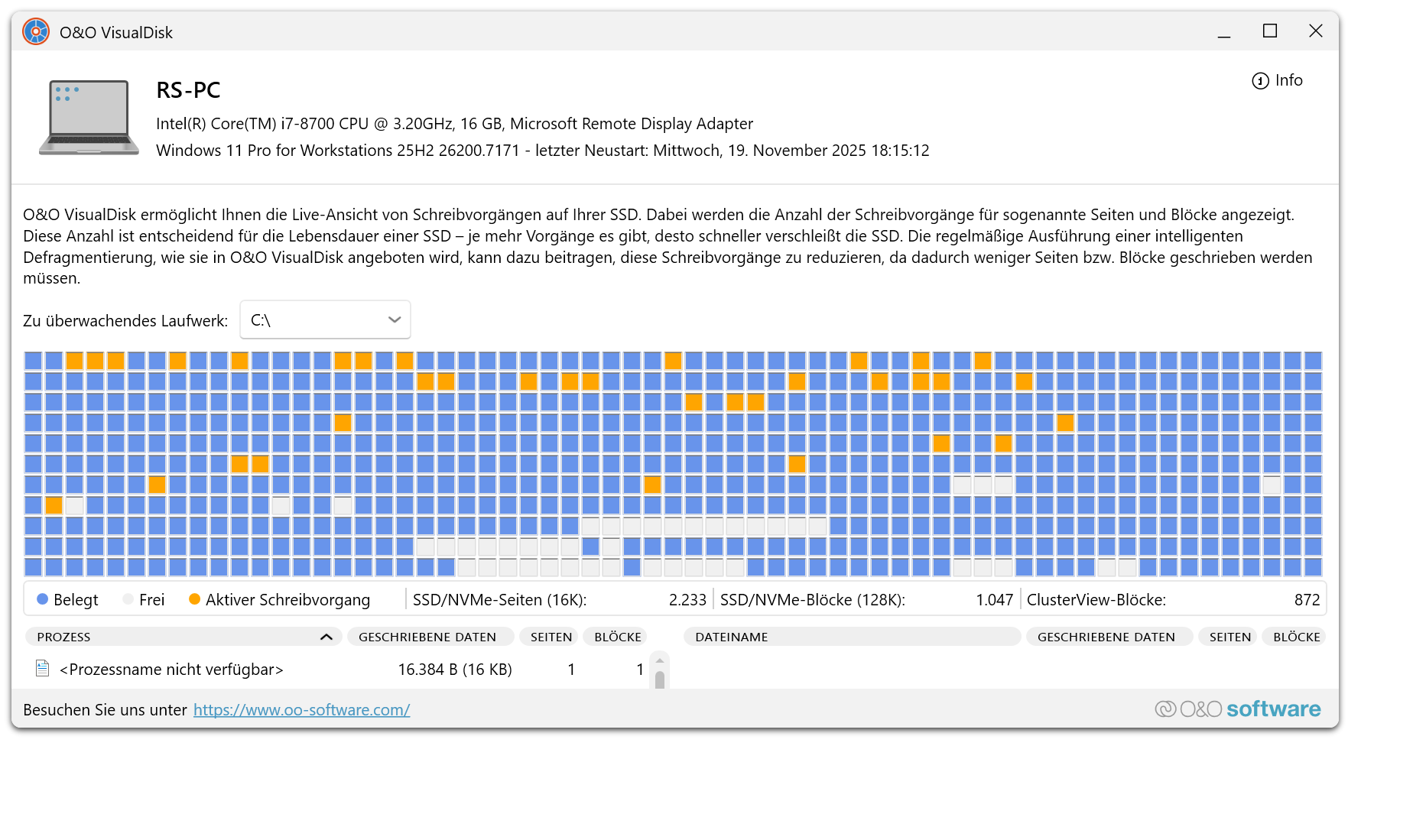 Mit O&O VisualDisk erhalten Sie erstmals eine Live-Ansicht aller Schreibvorgänge auf flashbasierten Speichermedien wie SSDs und NVMe-Laufwerken. Die Software zeigt exakt, wie häufig sogenannte Seiten und Blöcke beschrieben werden – eine entscheidende Kennzahl für die Haltbarkeit einer SSD.