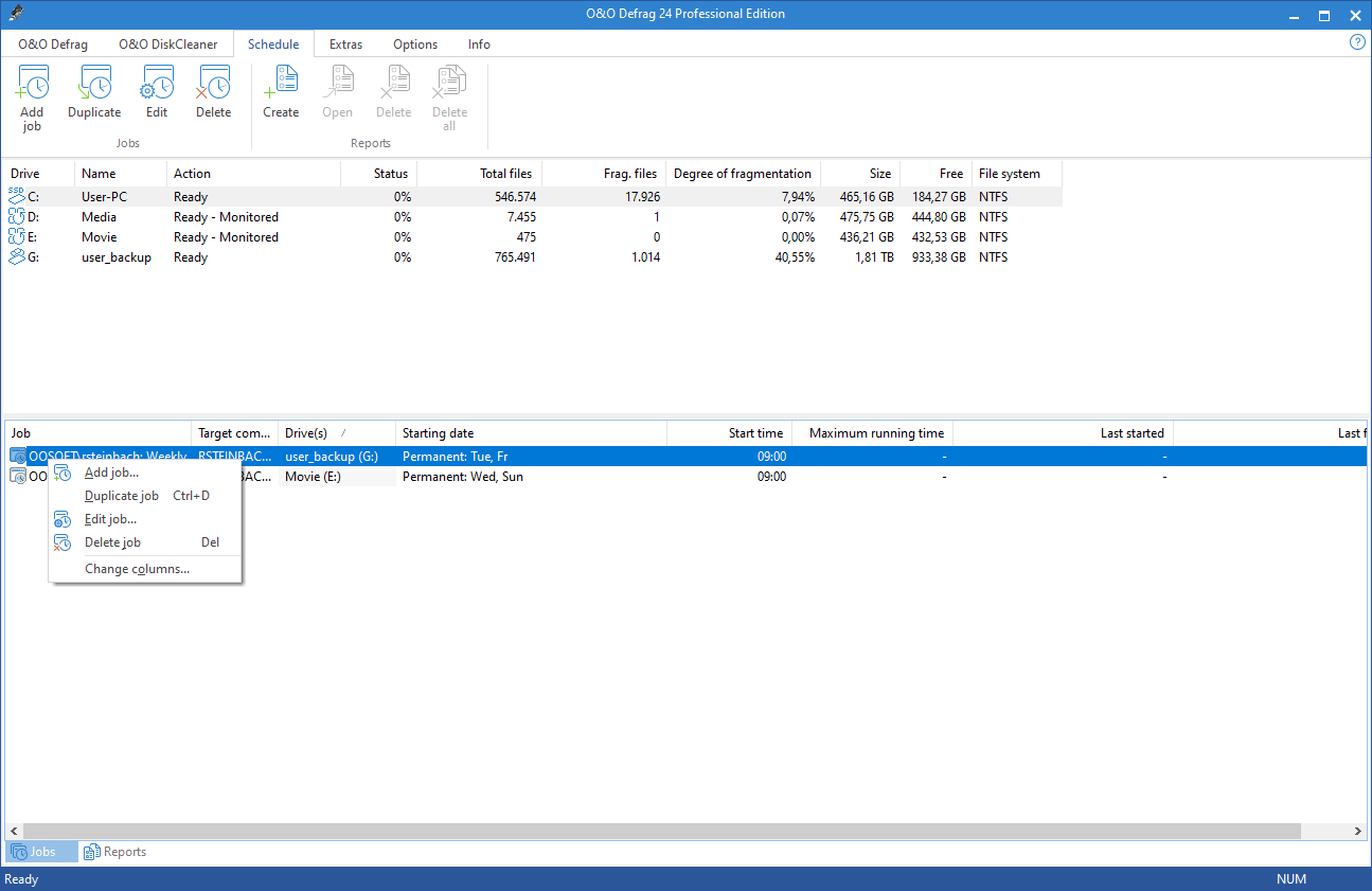 We recommend manual defragmentation for PCs that are being used heavily because only a user can decide when the time is right to give up the performance needed for running defragmentation. On computers using video editing or graphics applications, O&O Defrag can be configured to not start automatic optimization while certain programs are running. The default settings in O&O Defrag are more than adequate for ordinary desktop PCs running mainly internet or office applications. O&O Defrag is also perfect for notebooks. Whenever an external power supply is disconnected, O&O Defrag automatically goes into pause mode to save energy