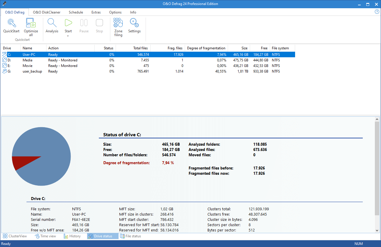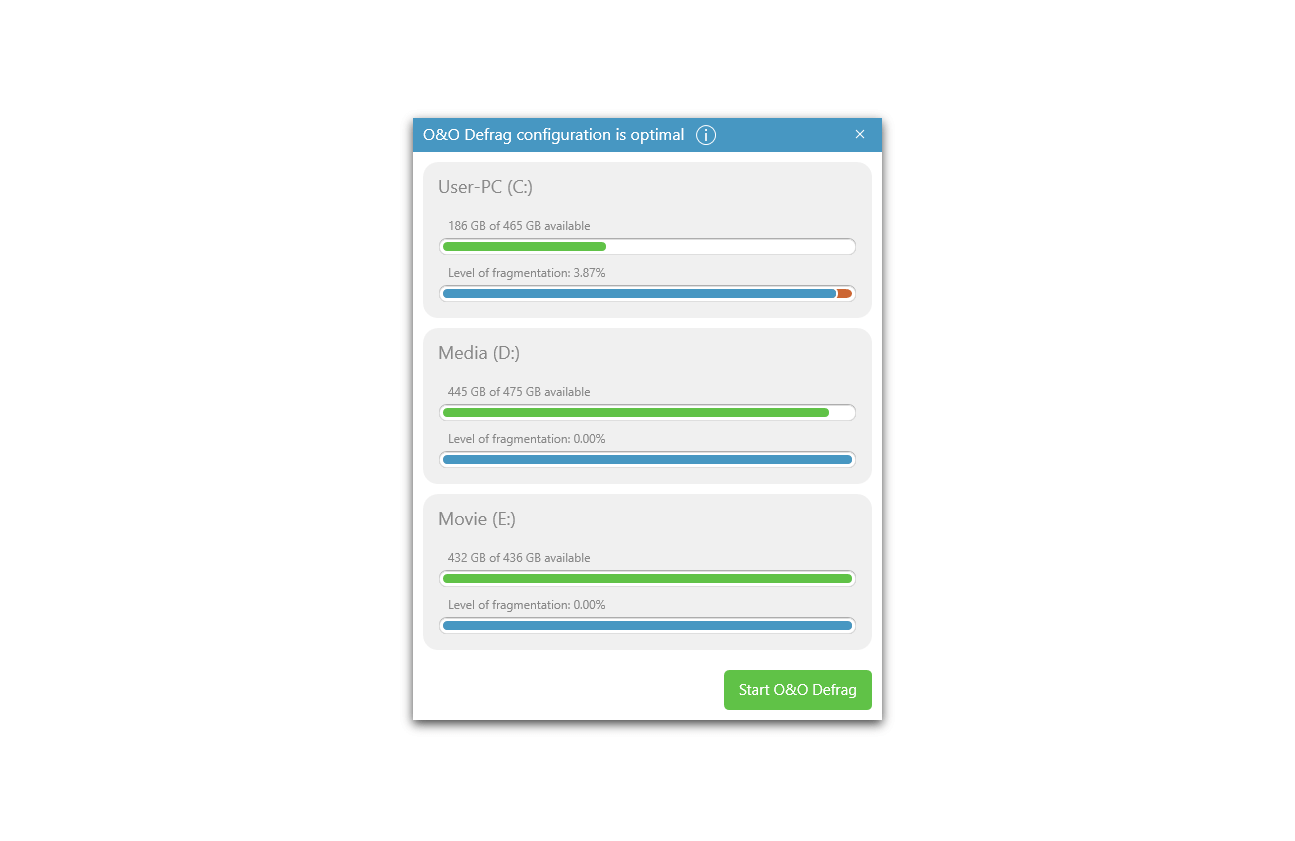 Automatic defragmentation can be configured with just three clicks and optimizes your disks behind the scenes with no negative impact on your computer’s performance. You can set O&O Defrag to run defragmentation at a certain level of fragmentation, on particular days of the week, or whenever your screensaver is being used. Defragmentation can be paused and resumed whenever you want because O&O Defrag automatically recognizes where defragmentation was interrupted.
