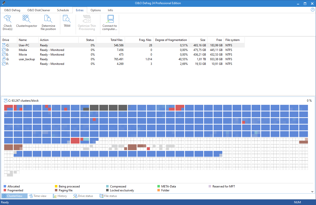 - ClusterView with SSDs: In order to represent the degree of fragmentation of an SSD, the ClusterView now maps the logical structure of an SSD so that, accordingly, 6 blocks are combined into one.